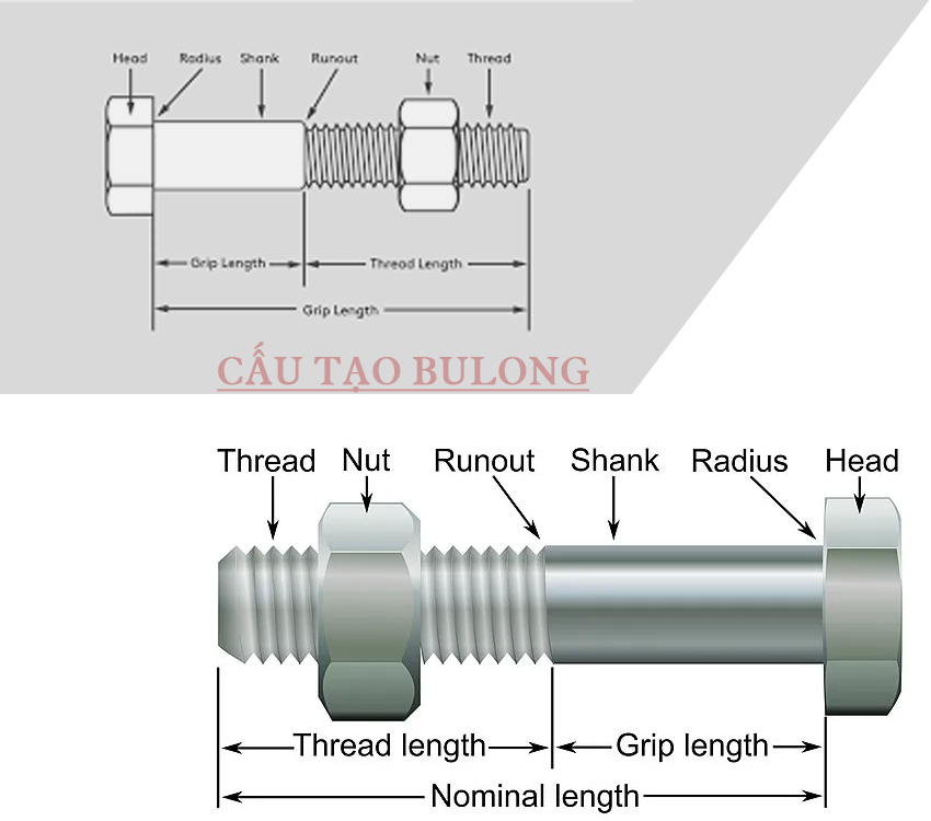 Thân bu lông: Hình trụ, có thể có ren suốt hoặc ren một phần.
